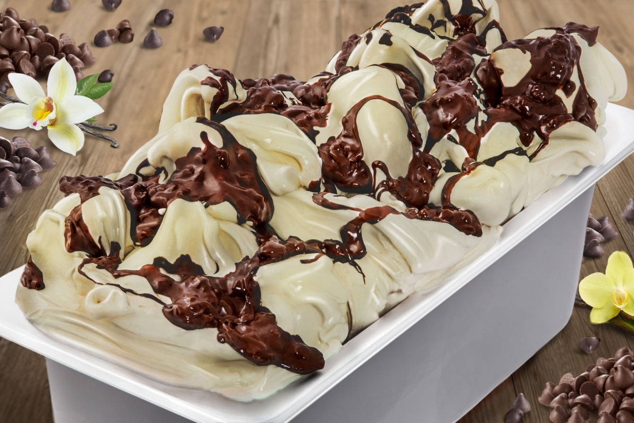 Agrega el agua en la licuadora. Mezcla el Aqua 5 con el azúcar y agrega en el agua mientras la licuadora está encendida. Después, agrega los otros ingredientes. Saboriza la calda base con el Algemix Leche Condensada, después continúa el proceso de producción normalmente. A la salida de la productora, mézclalo con la Pasta Chocolat Chocolate con Palomitas Specialitá.